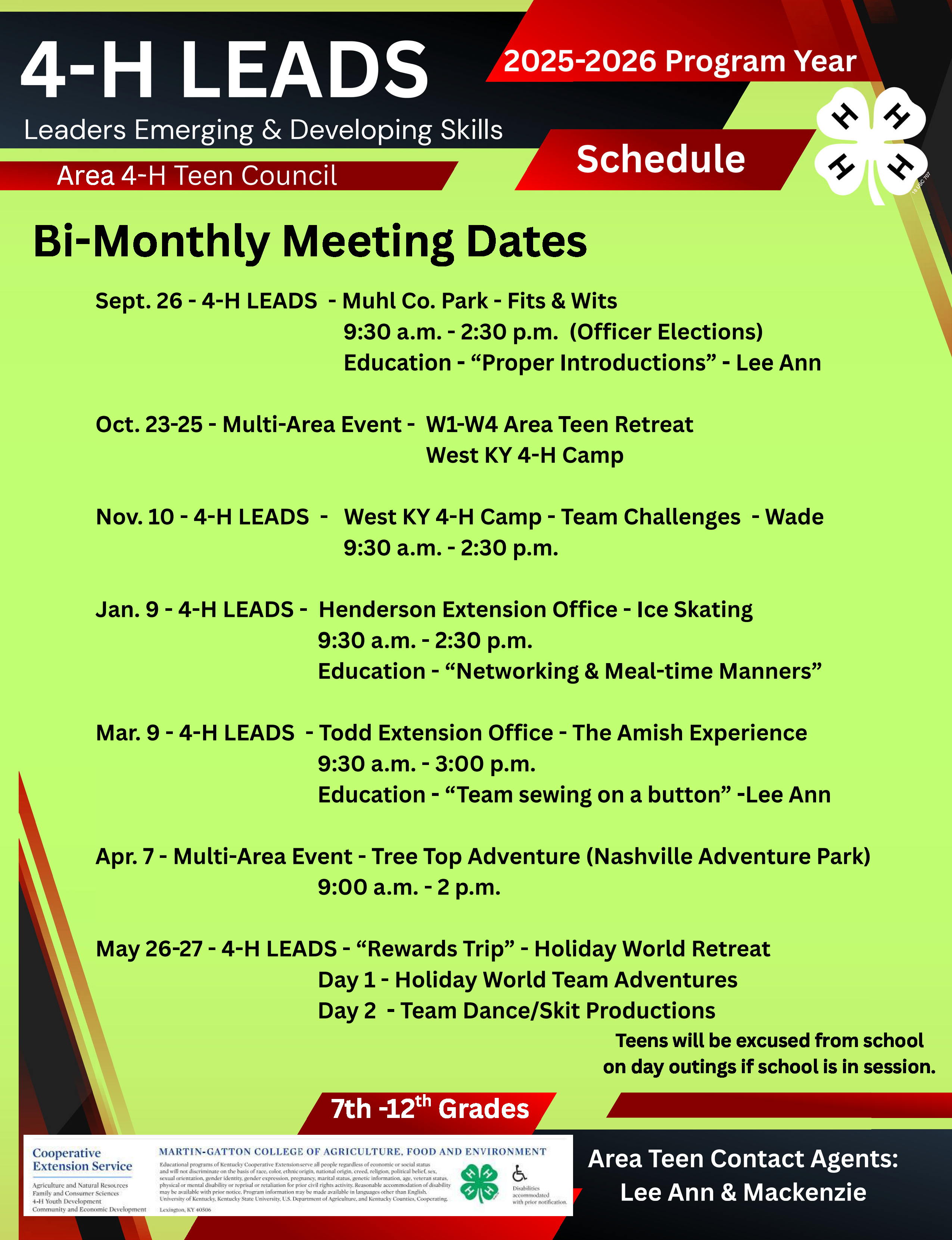 The 2025-2026 4-H Enrollment form is included under the "4-H Newsletters" section on this page. When you click on it and download, it can then be printed, completed, and mailed to our office at 3341 Zion Road, Henderson, KY 42420. You can also complete it electronically and e-mail it to amber.adair@uky.edu.